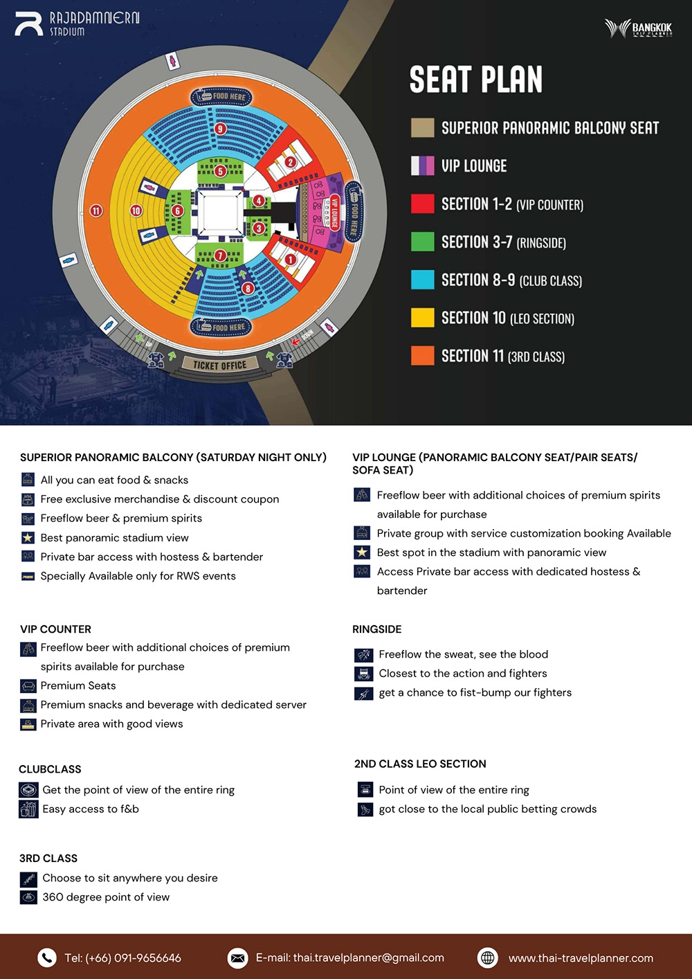 | 17:30 PM | Arrive at Rajadamnern Stadium. Exchange e-ticket for a physical one at the “Boxing Muay Thai” kiosk. (Doors open at 5:00 PM.) |
