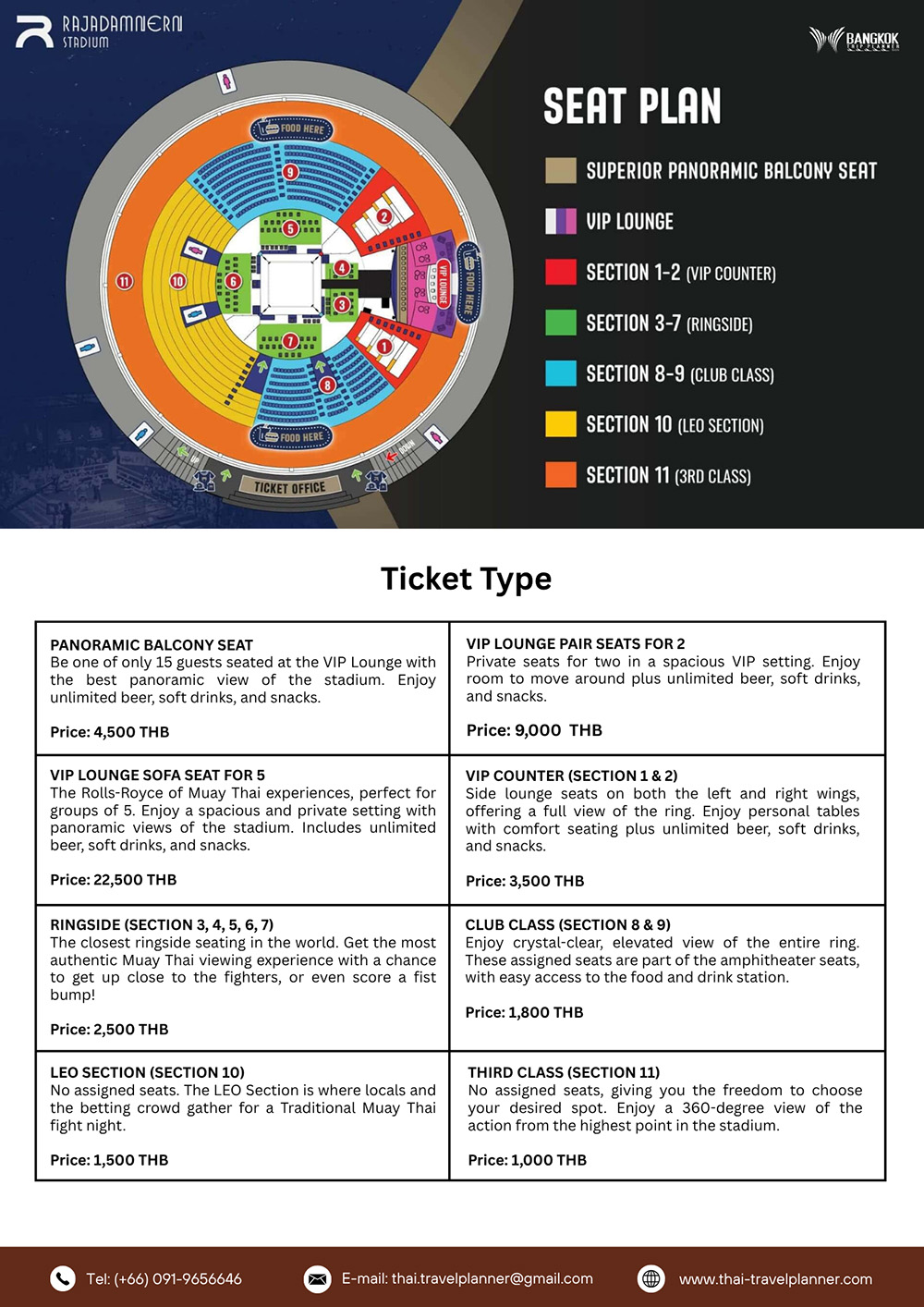 | 17:30 PM | Arrive at Rajadamnern Stadium. Exchange e-ticket for a physical one at the “Boxing Muay Thai” kiosk. (Doors open at 5:00 PM.) |